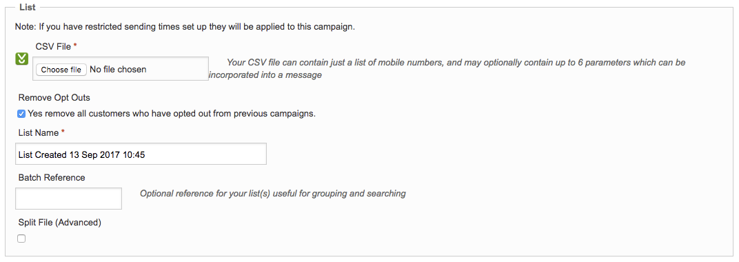 Menggunakan file CSV dengan daftar penerima. Ini bisa sesederhana satu kolom dengan daftar nomor ponsel Anda (harap diperhatikan bahwa mereka harus diformat ‘+XX XXX XXXX’ dimulai dengan kode negara) ATAU hingga enam kolom dengan parameter yang dapat membantu membentuk pesan Anda. Untuk informasi lebih lanjut tentang parameter lihat di sini .