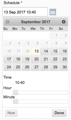 Schedule - Pilih ikon kalender untuk menampilkan kalender dinamis tempat Anda dapat memilih tanggal dan waktu. Anda juga memiliki pilihan untuk mengklik " Now " yang akan mengatur pesan kampanye ke waktu saat ini. Klik tombol " Done " setelah Anda selesai memilih.