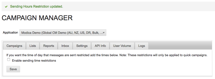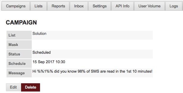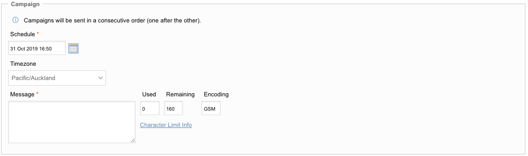 Message - Masukkan pesan kampanye Anda di sini. Gunakan kotak Character Count untuk membantu Anda menghitung jumlah karakter. Selalu pastikan bahwa karakter tidak melebihi batas 160. Jika ya, Anda akan ditagih untuk pesan tambahan, dan mengklik tombol Save di akhir proses mengkonfirmasi hal ini. Terakhir, pastikan bahwa kotak Encoding menampilkan GSM kecuali Anda memerlukan pengkodean yang berbeda misalnya untuk teks Arab.