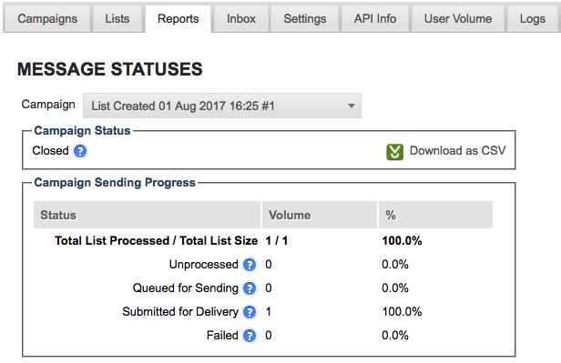 Kampanye (berdasarkan waktu mulai yang bertambah) akan tetap muncul di tab Campaign. Setelah ini disimpan, file CSV Anda akan disetel dalam daftar dan kampanye terpisah berdasarkan setelan yang baru saja Anda pilih. Daftar (Split) akan muncul di tab “Lists”. Kampanye akan tetap muncul di tab “Campaign”.
