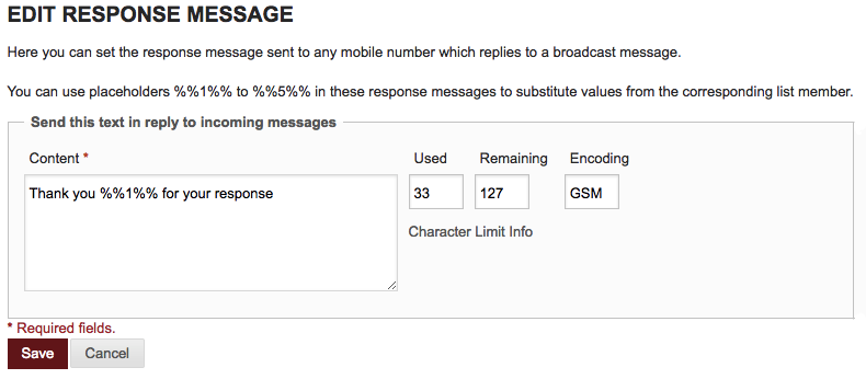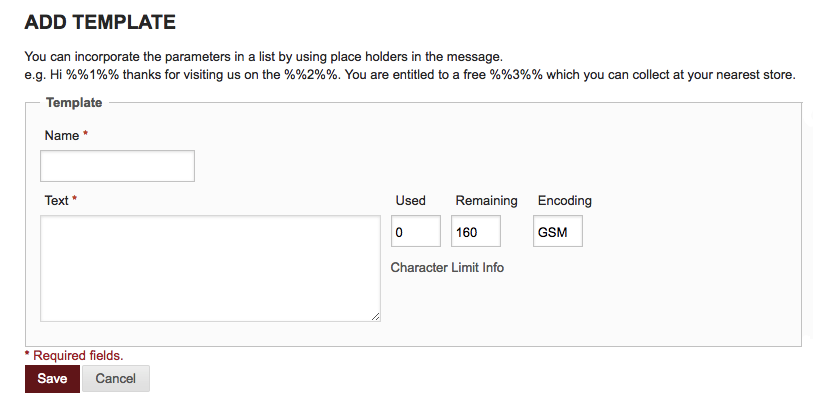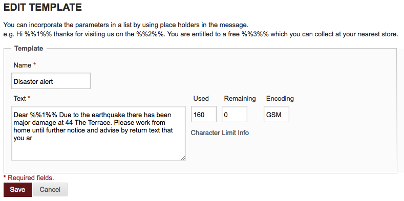 Ingat bahwa pesan dibatasi hingga 160 karakter. Jika Anda memutuskan untuk menggunakan opsi Parameter, pertimbangkan jumlah karakter yang akan digunakan oleh setiap parameter yang dipilih. Misalnya: nama yang sangat panjang akan menggunakan lebih banyak karakter dalam pesan yang sebenarnya (walaupun sistem hanya menampilkan 5 karakter yaitu %%1%%) membuat pesan yang sebenarnya lebih panjang. Oleh karena itu akan mengirim 2 atau lebih pesan ke handset.