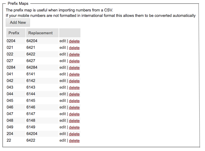 Anda juga dapat menyiapkan peta prefix, yang akan mengonversi prefix apa pun yang belum diformat dengan benar (dalam file unggahan CSV Anda). Tambahkan prefix yang ingin Anda konversi di bagian “prefix”. misal: tambahkan prefix 021 untuk diganti dengan 6421. Hasilnya 021555666 akan otomatis diubah menjadi +6421555666 jika peta prefix sudah ada.