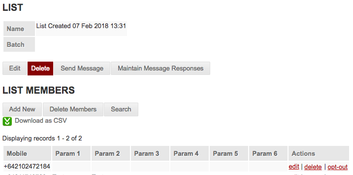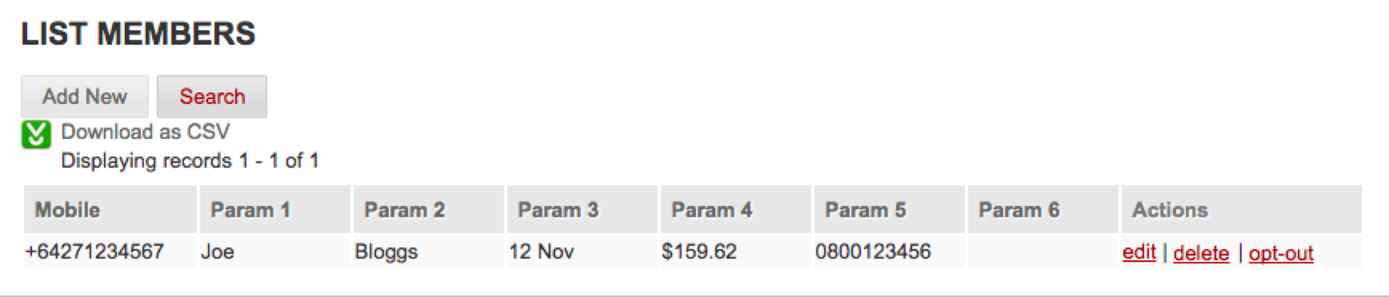 Halaman Add List Member menyajikan bidang yang harus diisi untuk menambahkan satu anggota ke daftar. Anda dapat menyalin dan menempelkan detail Anda ke setiap bidang yang relevan atau cukup ketikkan datanya. Nomor ponsel harus dimasukkan dalam format internasional yaitu +64xxxxxxxx. Bidang Param dapat digunakan untuk informasi tambahan.