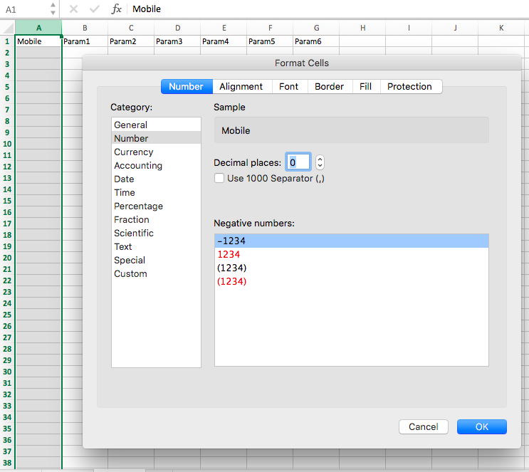 Format kolom pertama (dengan nomor ponsel) dengan tempat desimal diatur ke nol.