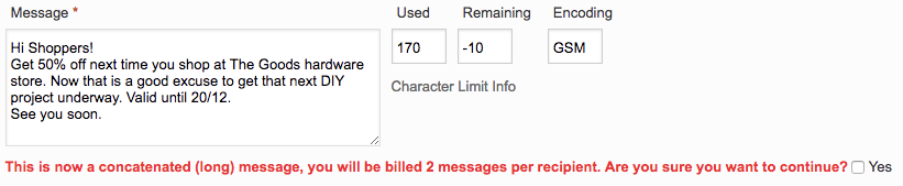 Harap perhatikan bahwa jika pesan Anda lebih dari 160 karakter, Anda akan melihat pemberitahuan yang menjelaskan bahwa Anda akan dikenakan biaya dua kali per pesan. Anda dapat mengetahui lebih lanjut tentang Batas Karakter disini.