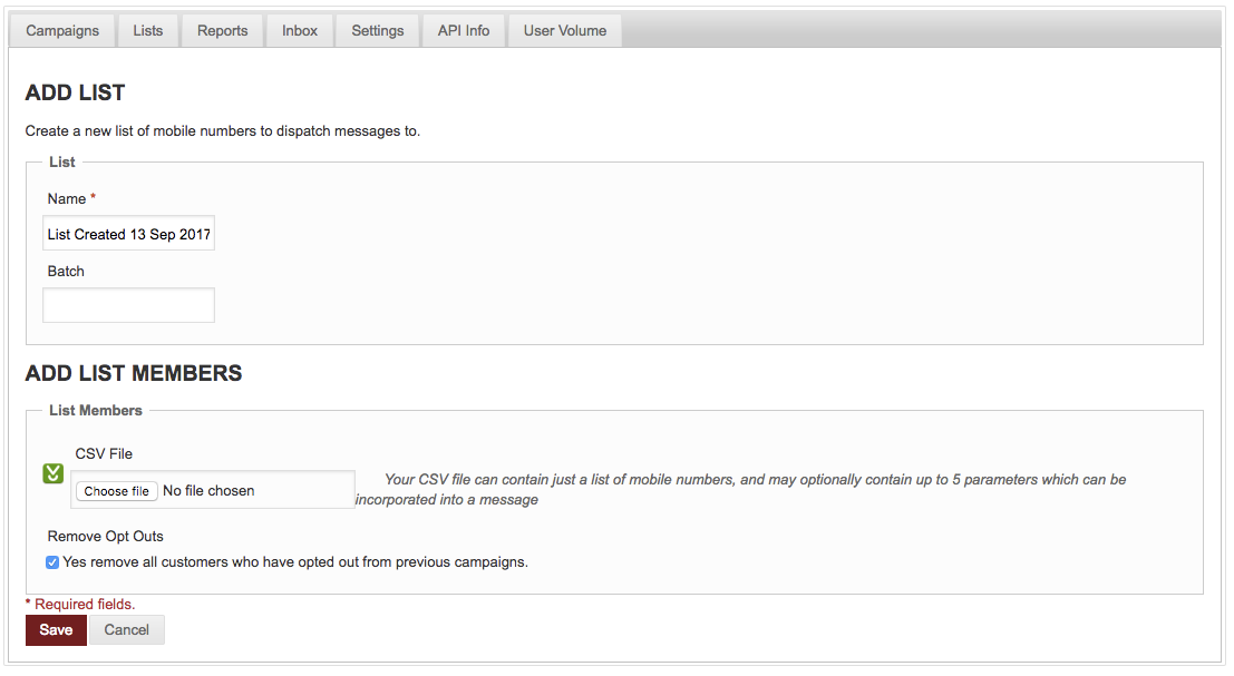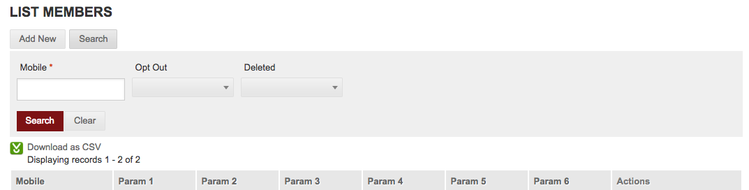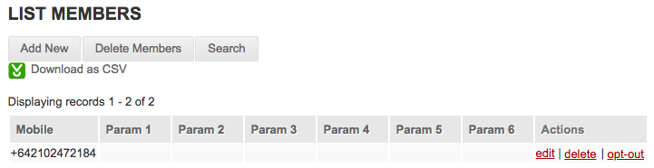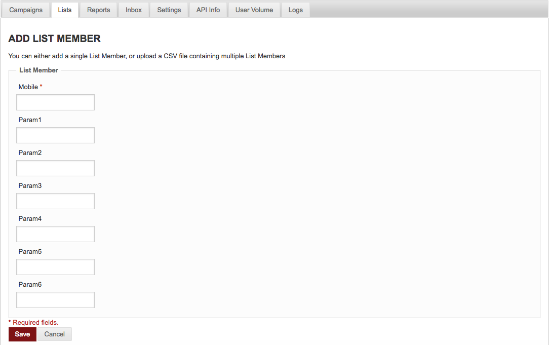 Halaman Add List Member menyajikan bidang yang harus diisi untuk menambahkan satu anggota ke daftar. Anda dapat menyalin dan menempelkan detail Anda ke setiap bidang yang relevan atau cukup ketikkan datanya. Nomor ponsel harus dimasukkan dalam format internasional yaitu +64xxxxxxxx. Bidang Param dapat digunakan untuk informasi tambahan.