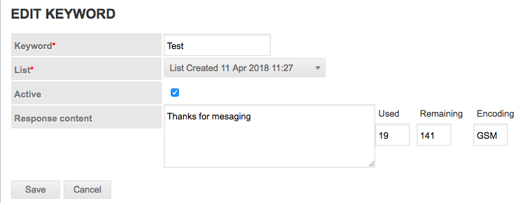 Response Content - ini akan menjadi respons konfirmasi yang diberikan kepada orang-orang yang memilih kata kunci khusus ini.
