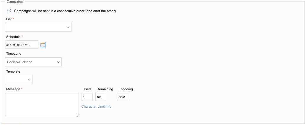 Message - Masukkan pesan kampanye Anda di sini. Gunakan kotak Character Count untuk membantu Anda menghitung jumlah karakter. Selalu pastikan bahwa karakter tidak melebihi batas 160. Jika ya, Anda akan ditagih untuk pesan tambahan, dan mengklik tombol Save di akhir proses mengkonfirmasi hal ini. Terakhir, pastikan bahwa kotak Encoding menampilkan GSM kecuali Anda memerlukan pengkodean yang berbeda misalnya untuk teks Arab.