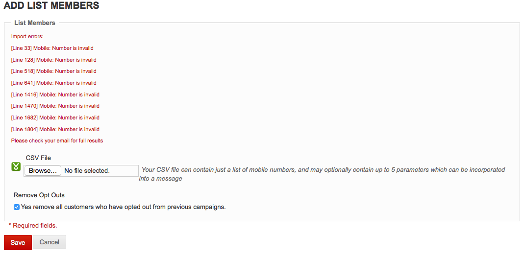 Jika daftar Anda tidak berhasil diunggah, biasanya itu berarti ada masalah dengan file Anda sehingga dokumen Anda mungkin memiliki beberapa kesalahan pemformatan. Lihat tangkapan layar di bawah untuk kesalahan impor: