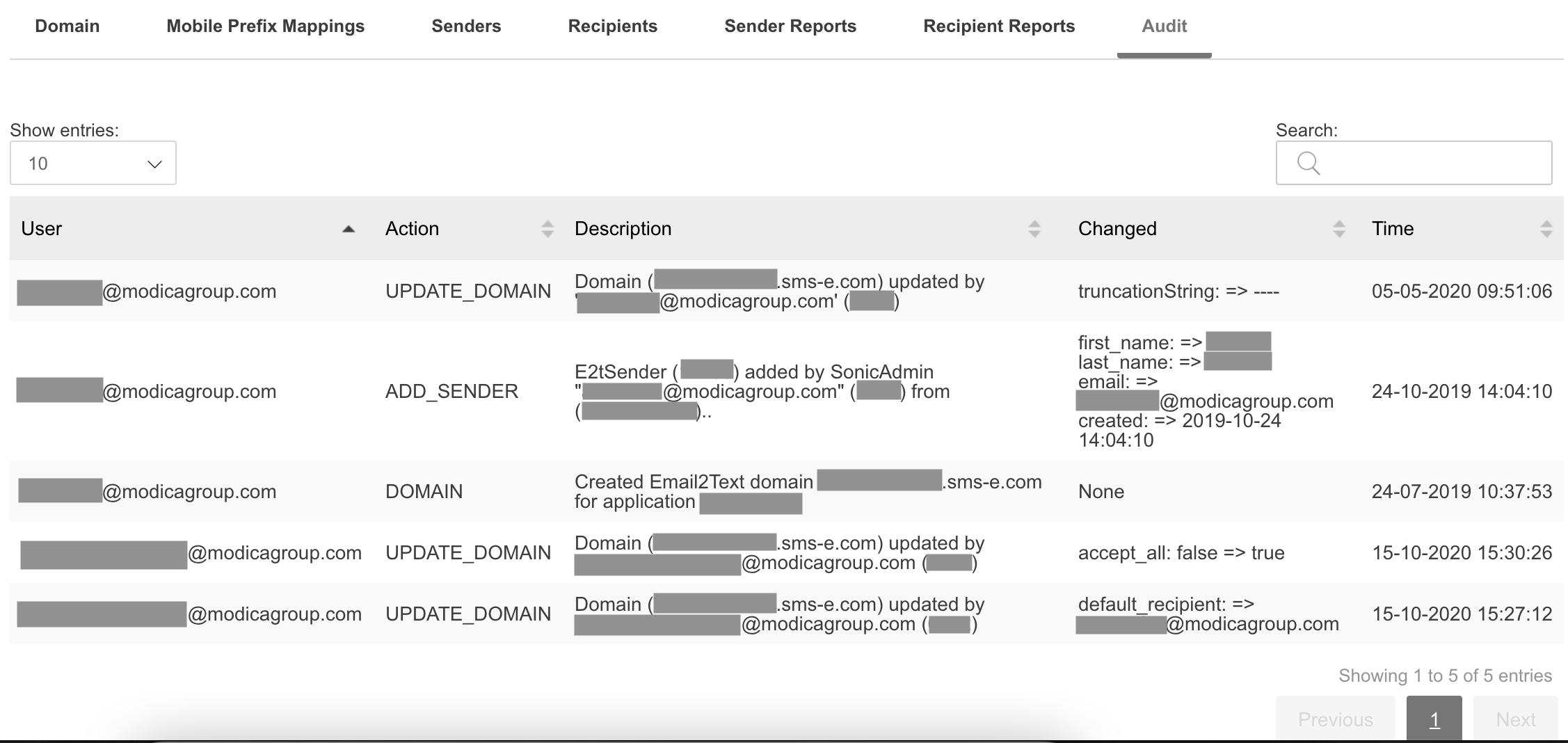 Bagian Audit Email2SMS menunjukkan riwayat perubahan konfigurasi yang dilakukan pada domain Anda. Ini termasuk pembaruan yang dilakukan pada pengaturan domain serta konfigurasi pengirim dan penerima.