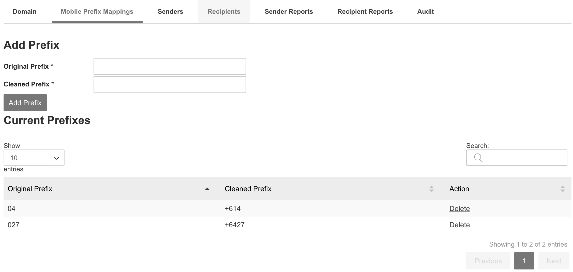 Untuk melihat pemetaan awalan yang dikonfigurasi untuk organisasi Anda, navigasikan ke tab Mobile Prefix Mappings. Anda dapat melihat: