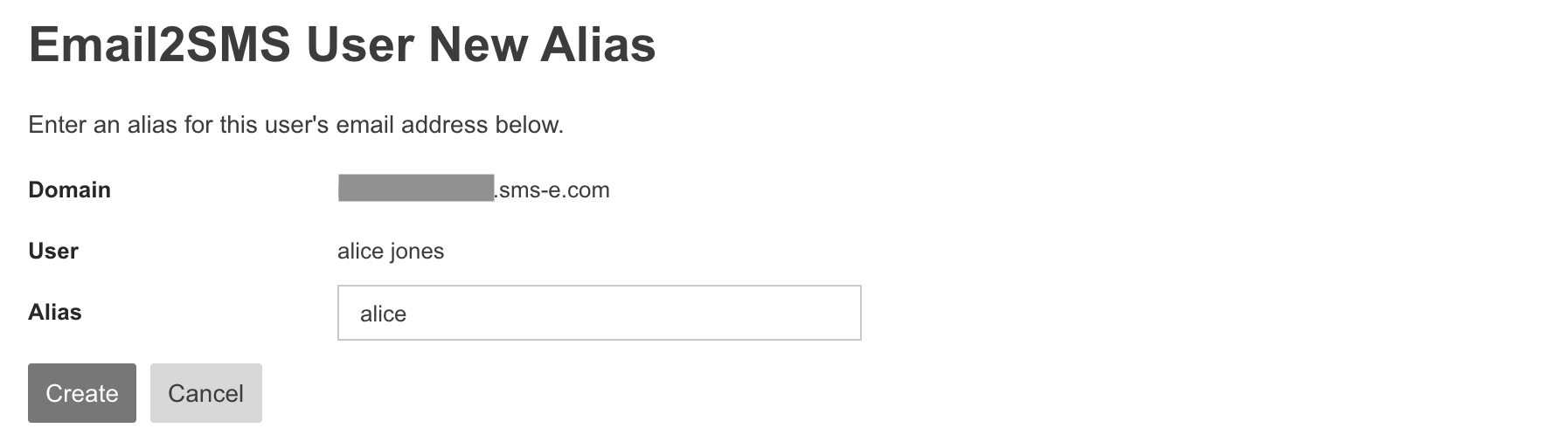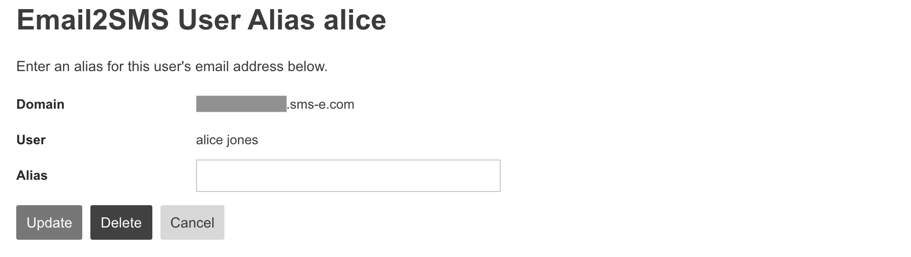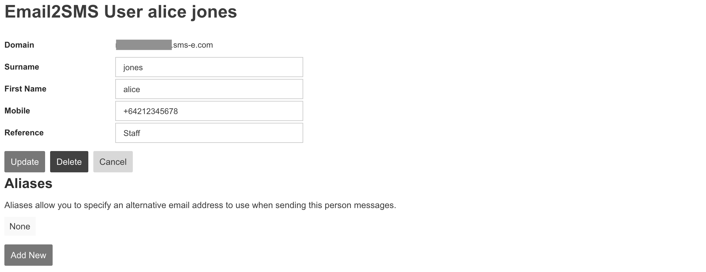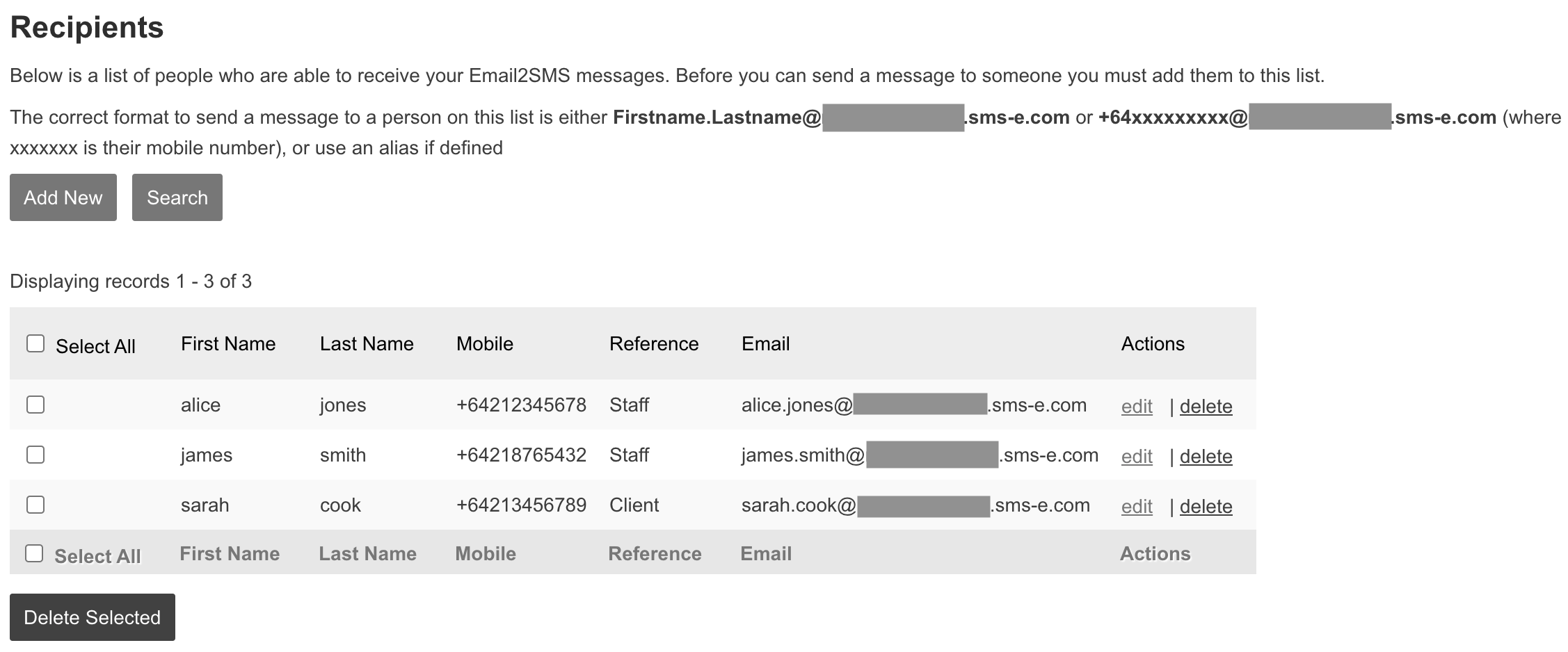 Misalnya, saat Anda membuat penerima Alice Jones, Email2SMS akan menghasilkan email untuk digunakan saat mengirim pesannya: ‘alice.jones@email2smsdomain’. Jika Anda menambahkan alias ‘alice’, Anda juga dapat menghubunginya di ‘alice@email2smsdomain’.