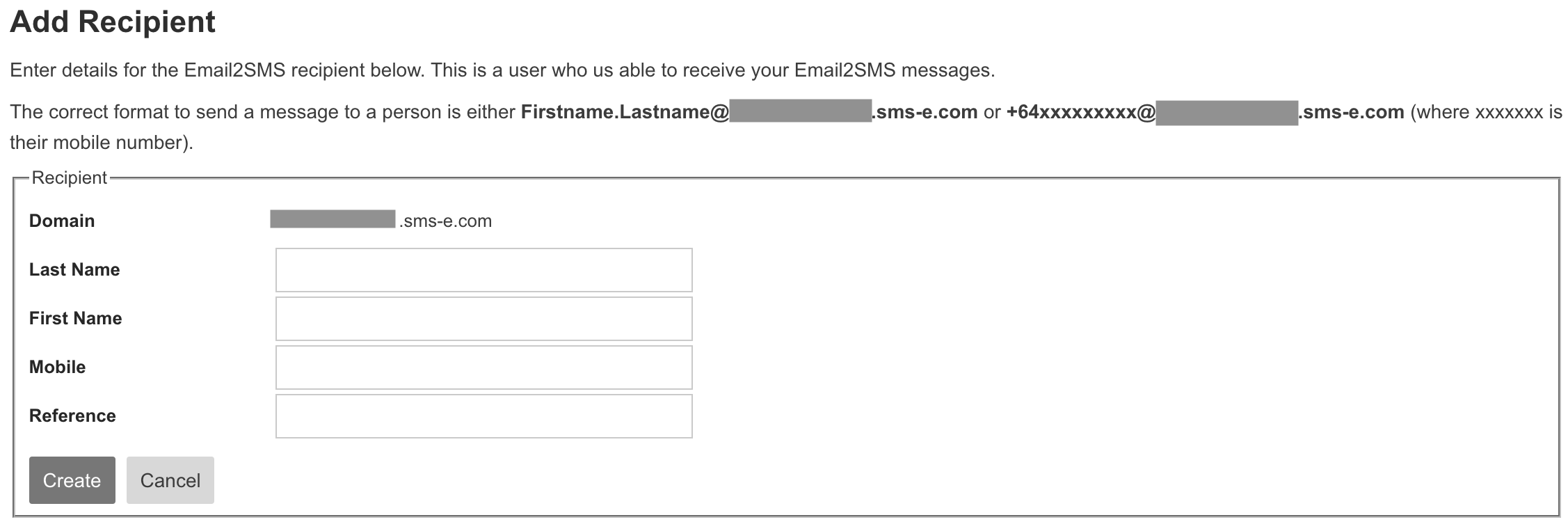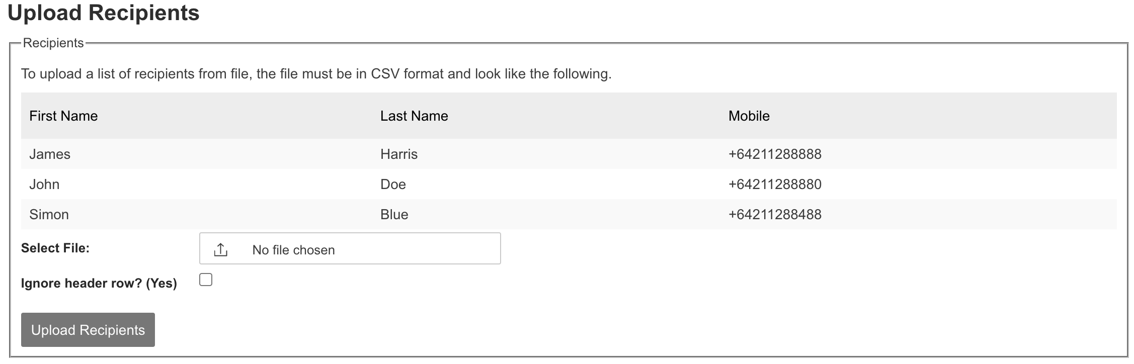 | 3 | Mobile | Recipient’s mobile phone number. | Required | Correctly formatted mobile phone number, beginning with the country code. For example, New Zealand phone numbers should begin with +64, and Australian with +61. | Maximum 16 characters. |