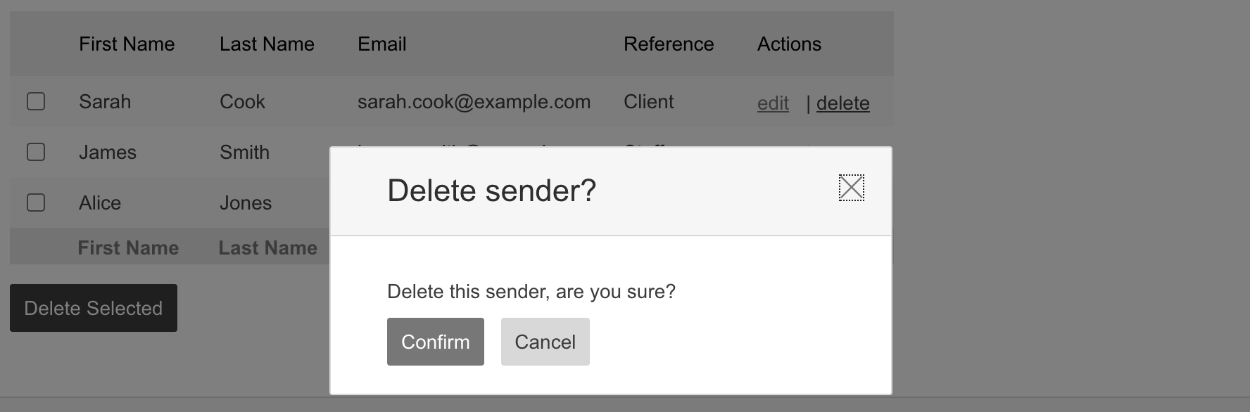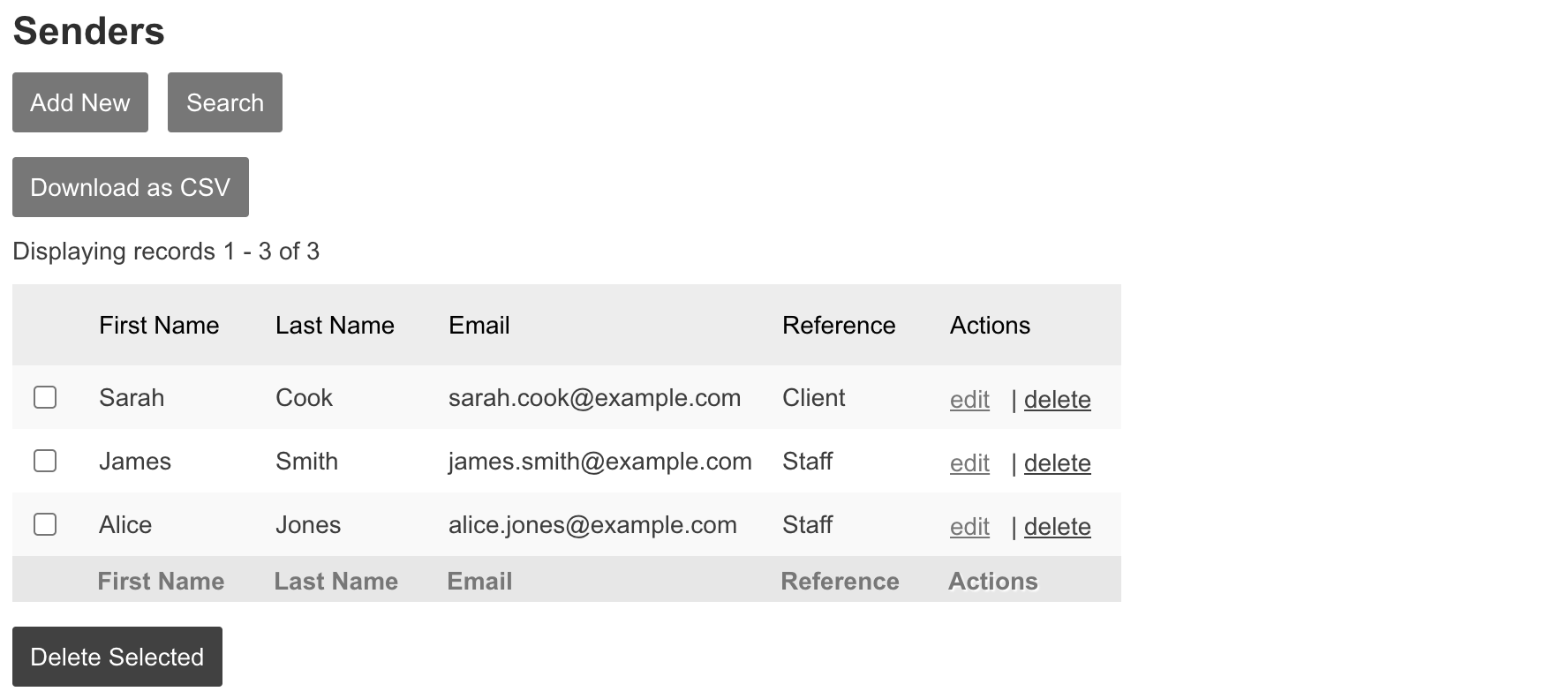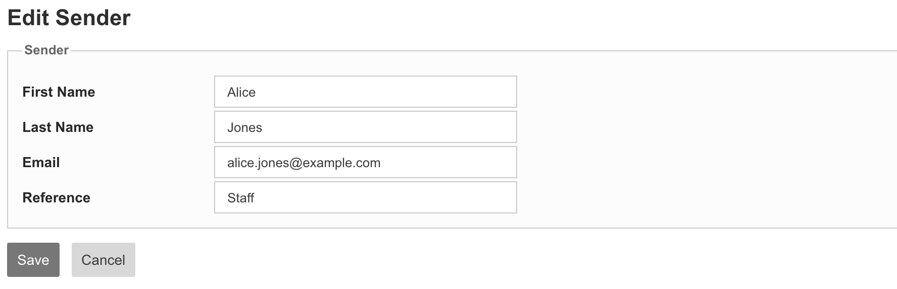 | 4 | Reference | An optional reference to categorise this sender. | Optional | Alphanumeric characters. | Maximum 255 characters. |