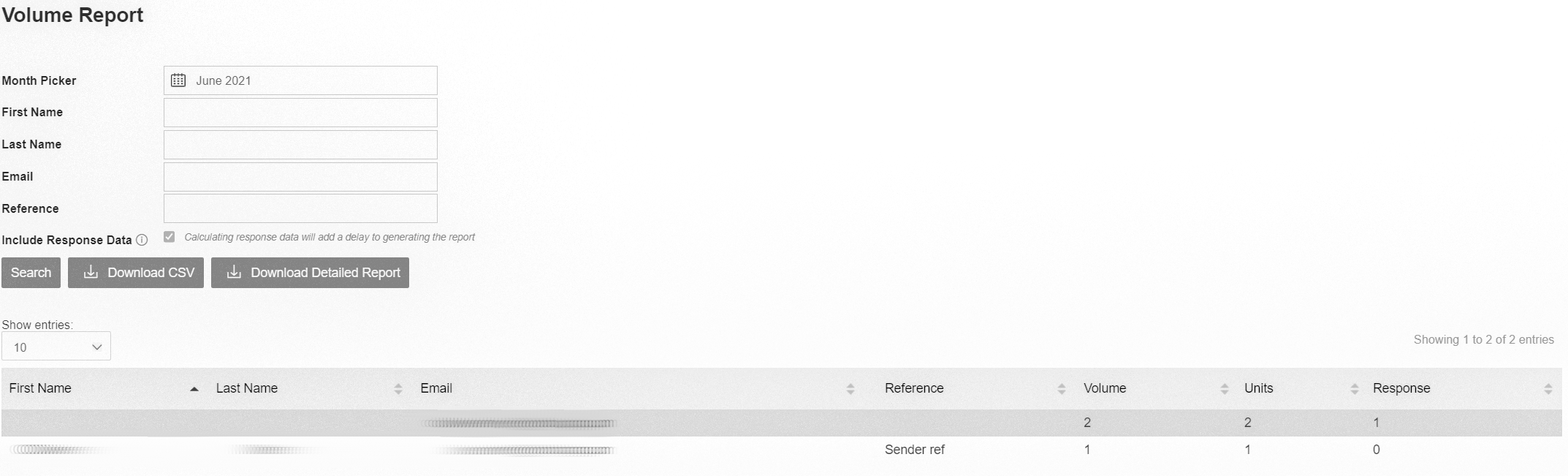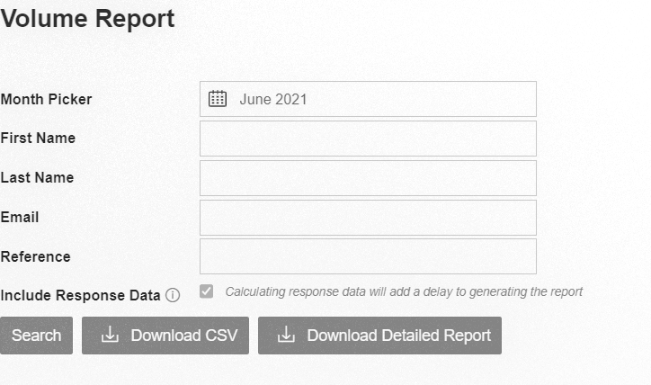 Laporan Volume tersedia dalam dua versi ekspor, Laporan Volume Pengirim/Sender Volume report dan Detailed Volume Report/Laporan Volume Terperinci